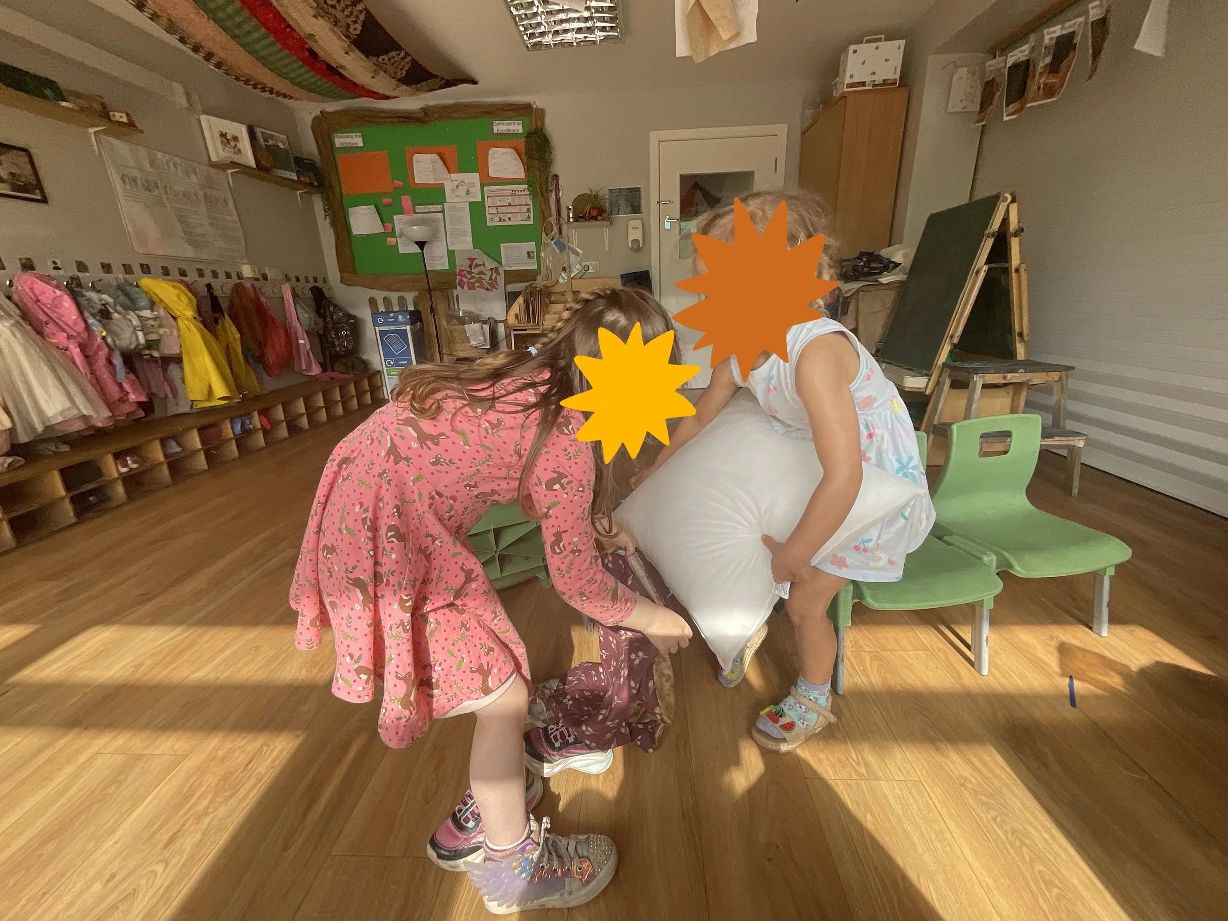 At the nursery I work at, I added sewing into our curriculum with simple activities involving cardboard, yarn, plastic needles or tapestry needles, hessian - then eventually we built upon what they had learned and I brought my sewing machine into the nursery for us to make cushion covers with zippers. The children are learning the different parts of the machine, how it works, how to thread the machine, and how to use their hand-eye coordination. We put cushions into their covers, and now they live in our ‘Cozy Corner’ where the children go for a moment of calm.