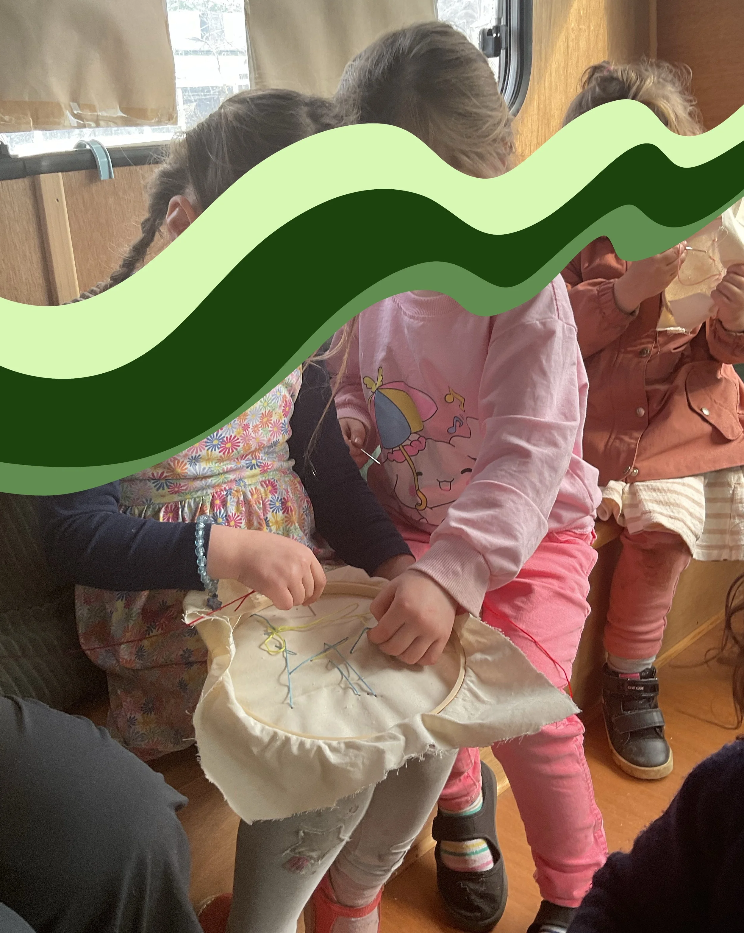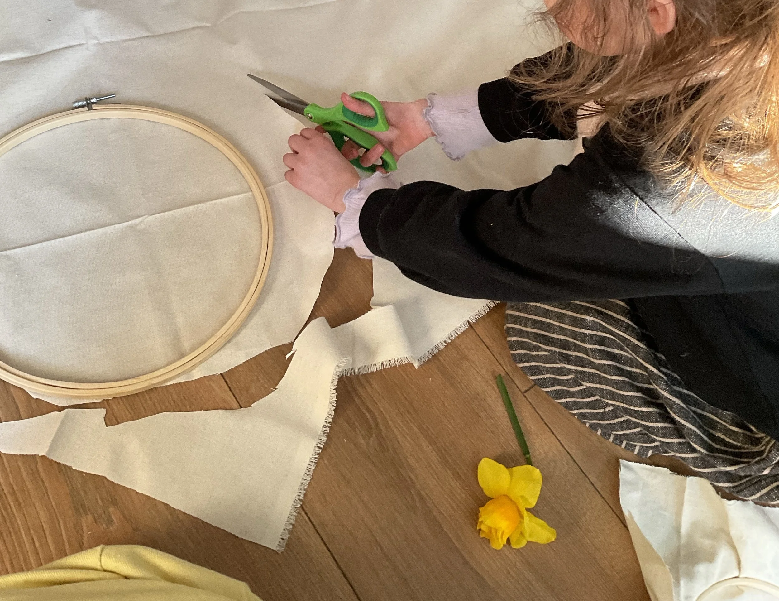 At the nursery I work at, I added sewing into our curriculum with simple activities involving cardboard and yarn. I felt strongly that the children could handle bigger projects, and so we used embroidery hoops, cut fabric, and started stitching all together. We created these pieces over many sewing sessions, and the children worked together to create colorful decorations for our nursery.