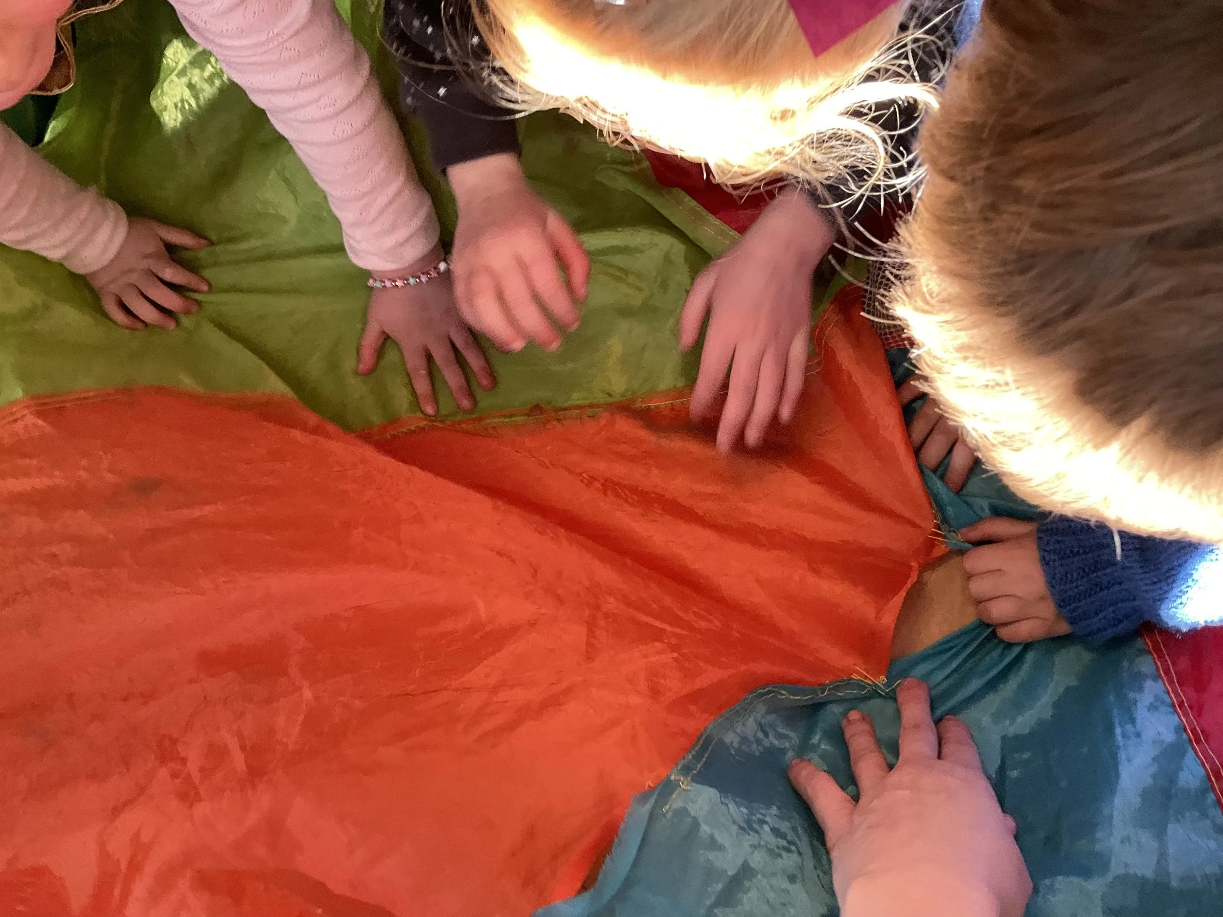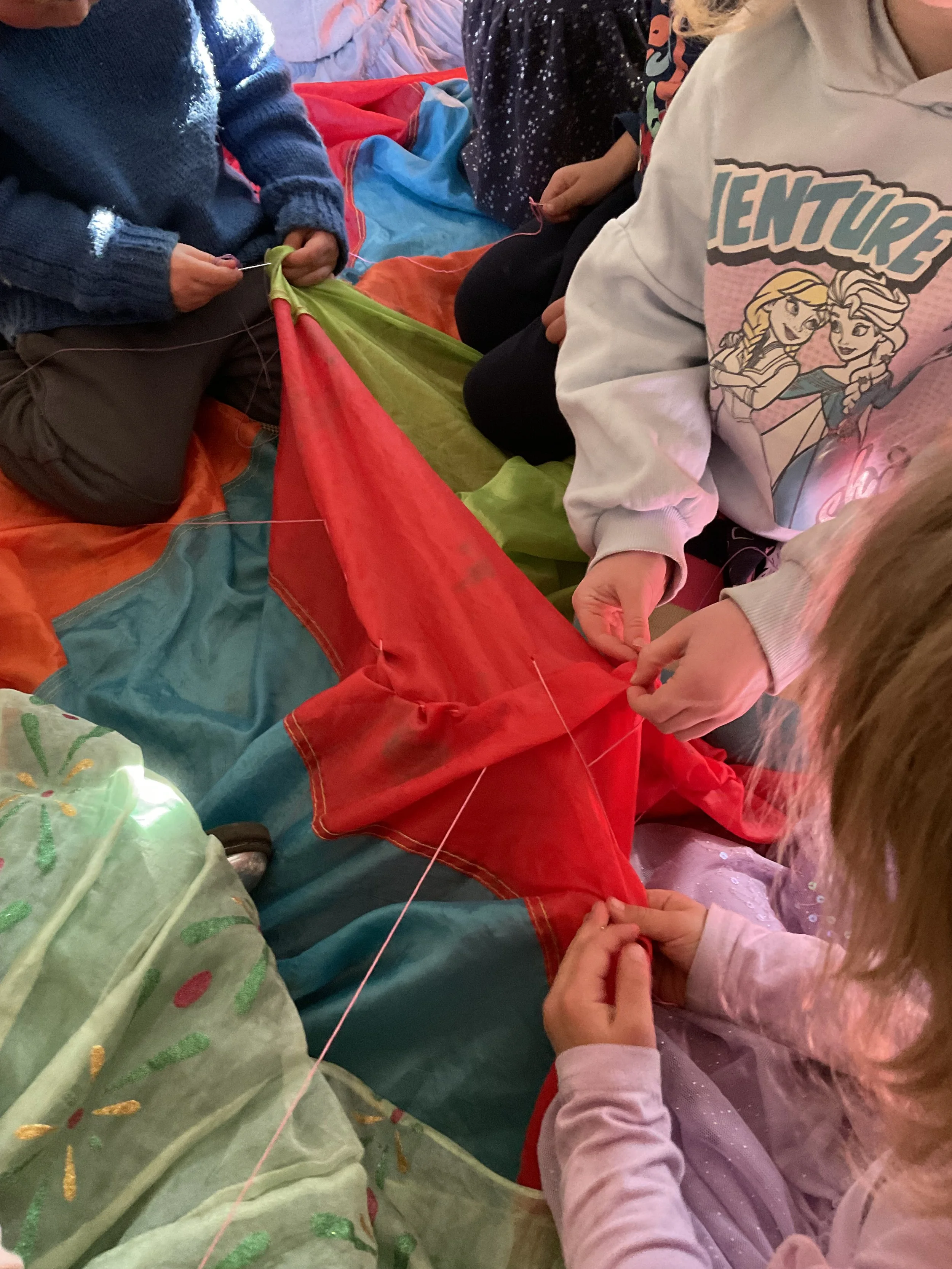 At the nursery I work at, we had a parachute with many holes. The children decided that we should mend it, and so we took our tapestry needles and got to work. Through mending, we gave our parachute another life, thus saving it from a fate in a landfill and helping to create more color-filled memories.
